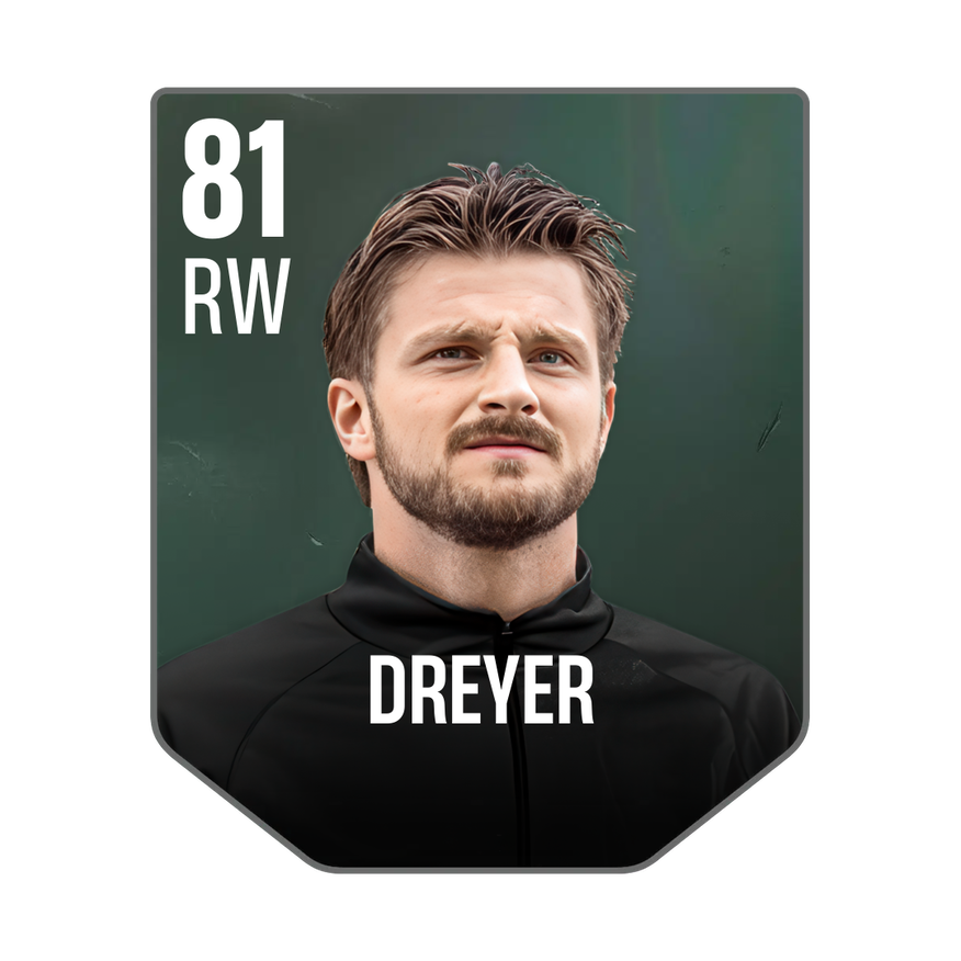 Base card is rated 81, he is a 174cm (5’9″) tall RW from Denmark and plays in the league World. Anders Dreyer has 4 cards available in UFL.