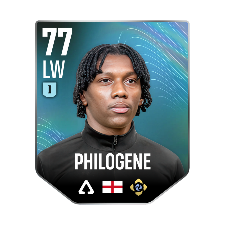 Mastery 1 card is rated 77, he is a 181cm (5’11″) tall LW from England and plays in the league England 2. Jaden Philogene has 2 cards available in UFL.