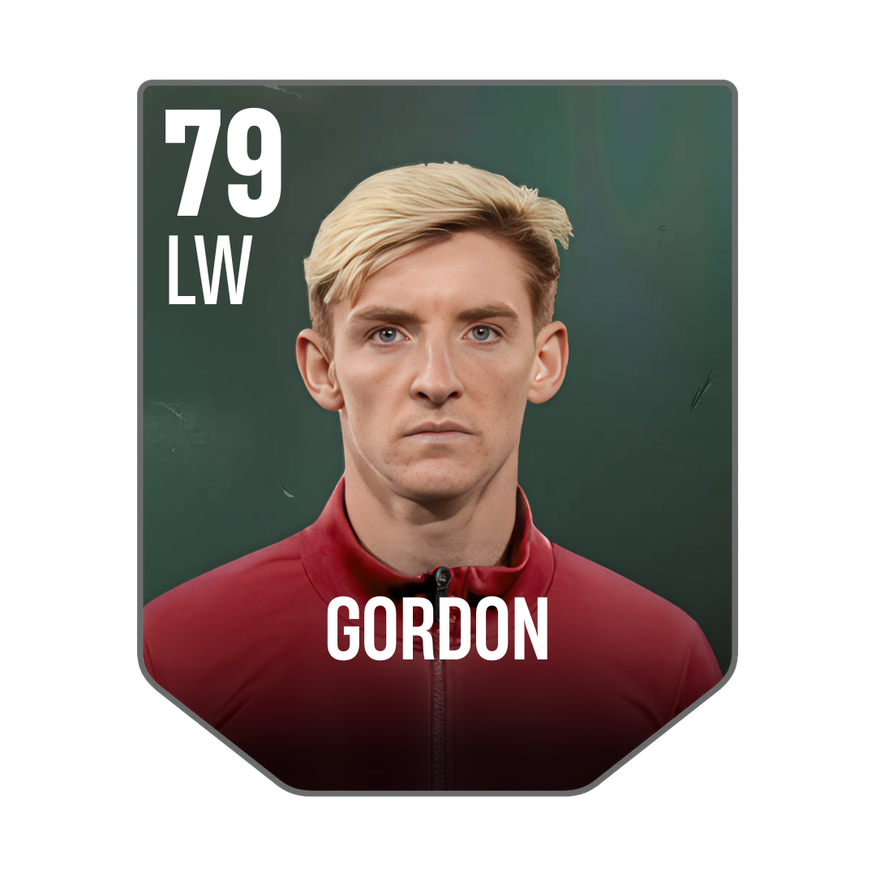 Base card is rated 79, he is a 183cm (6’0″) tall LW from England and plays in the league England 1. Anthony Gordon has 3 cards available in UFL.