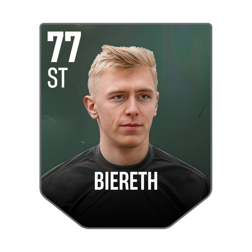 Base card is rated 77, he is a 187cm (6’2″) tall ST from Denmark and plays in the league France 1. Mika Biereth has 2 cards available in UFL.