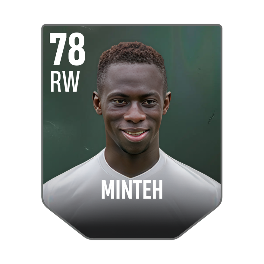 Base card is rated 78, he is a 180cm (5’11″) tall RW from Gambia and plays in the league England 1. Yankuba Minteh has 3 cards available in UFL.