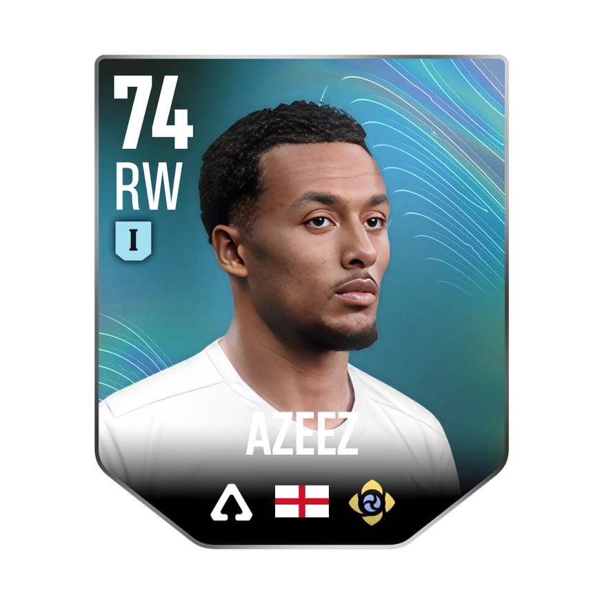 Mastery 1 card is rated 74, he is a 181cm (5’11″) tall RW from England and plays in the league England 2. Femi Azeez has 3 cards available in UFL.