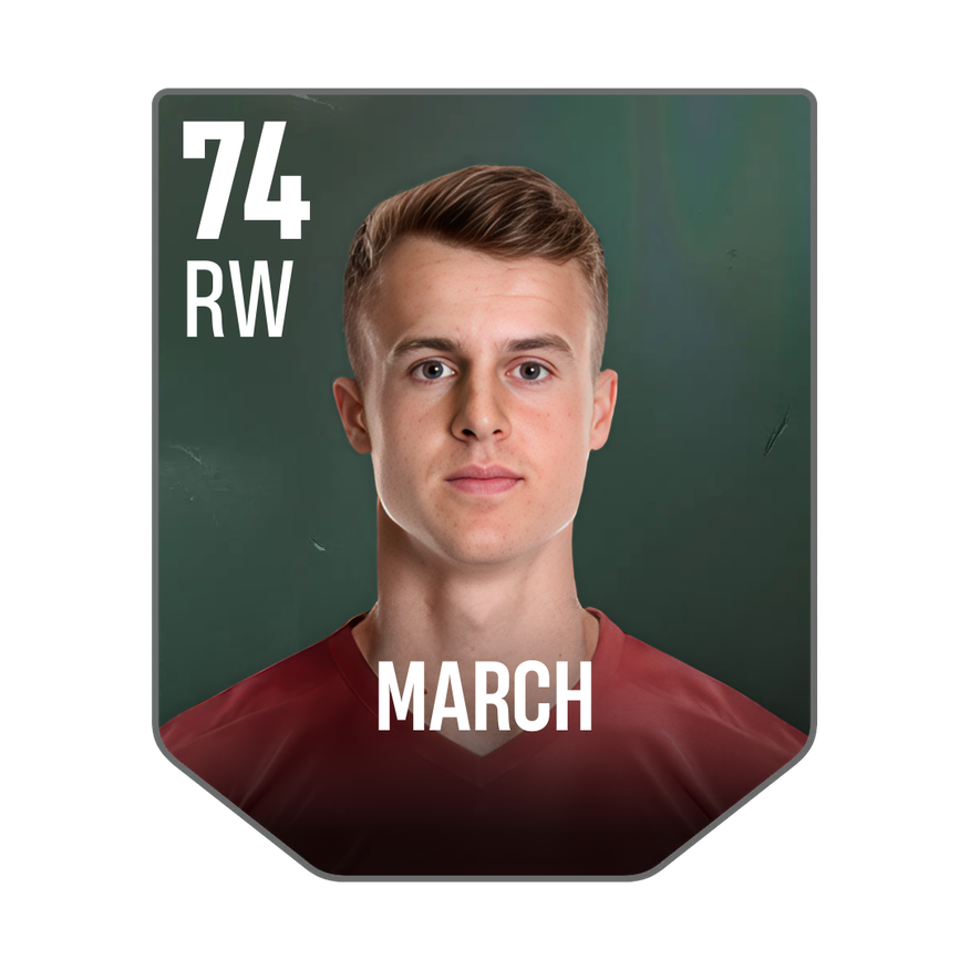 Base card is rated 74, he is a 180cm (5’11″) tall RW from England and plays in the league England 1. Solly March has 2 cards available in UFL.