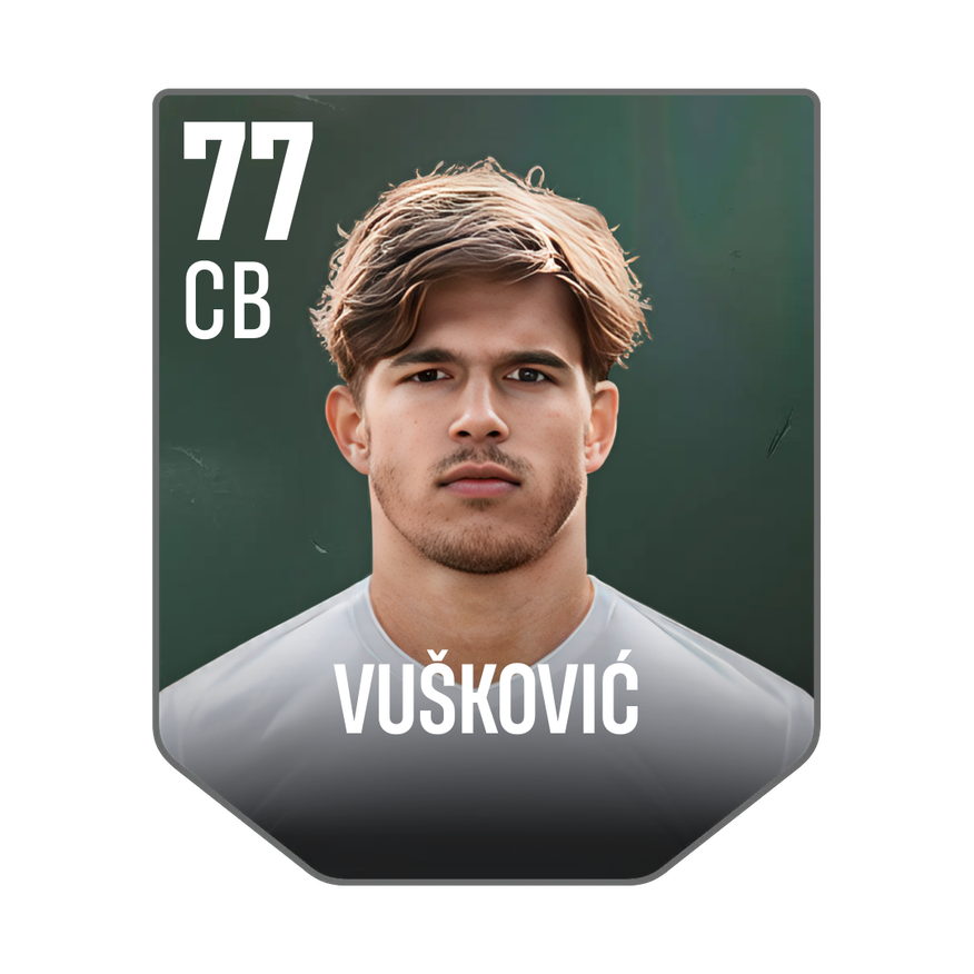 Base card is rated 77, he is a 193cm (6’4″) tall CB from Croatia and plays in the league World. Luka Vuskovic has 4 cards available in UFL.