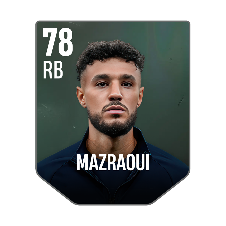 Base card is rated 78, he is a 183cm (6’0″) tall RB from Morocco and plays in the league England 1. Noussair Mazraoui has 4 cards available in UFL.
